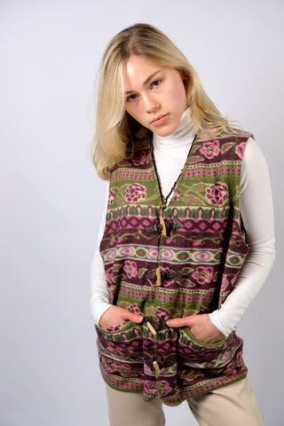 Vintage 90s Boho Blumen Print Fleece Weste - L